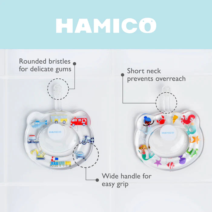 - Playful toy-like designs are baby friendly and make brushing time fun.