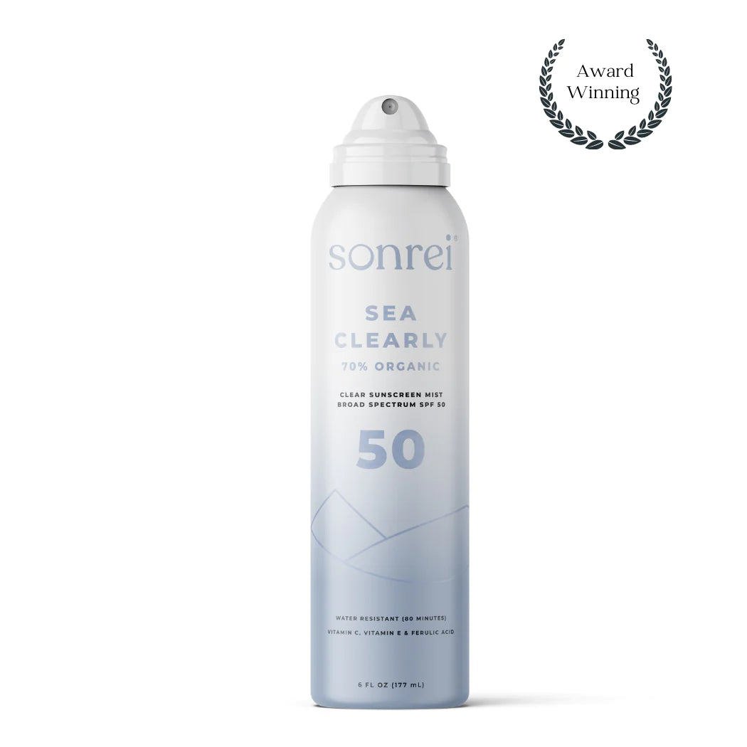 Sonrei Sea Clearly is a 70% organic clear sunscreen mist providing UVA/UVB protection for all skin types and pigments.