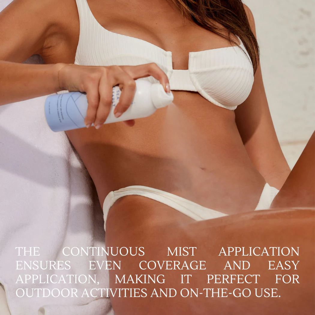 Our proprietary continuous mist bonds sunscreen ingredients and antioxidants while being gentle and pleasant feeling on skin. Spray on this clear ultra-sheer formula for water & sweat resistant protection and hydration.