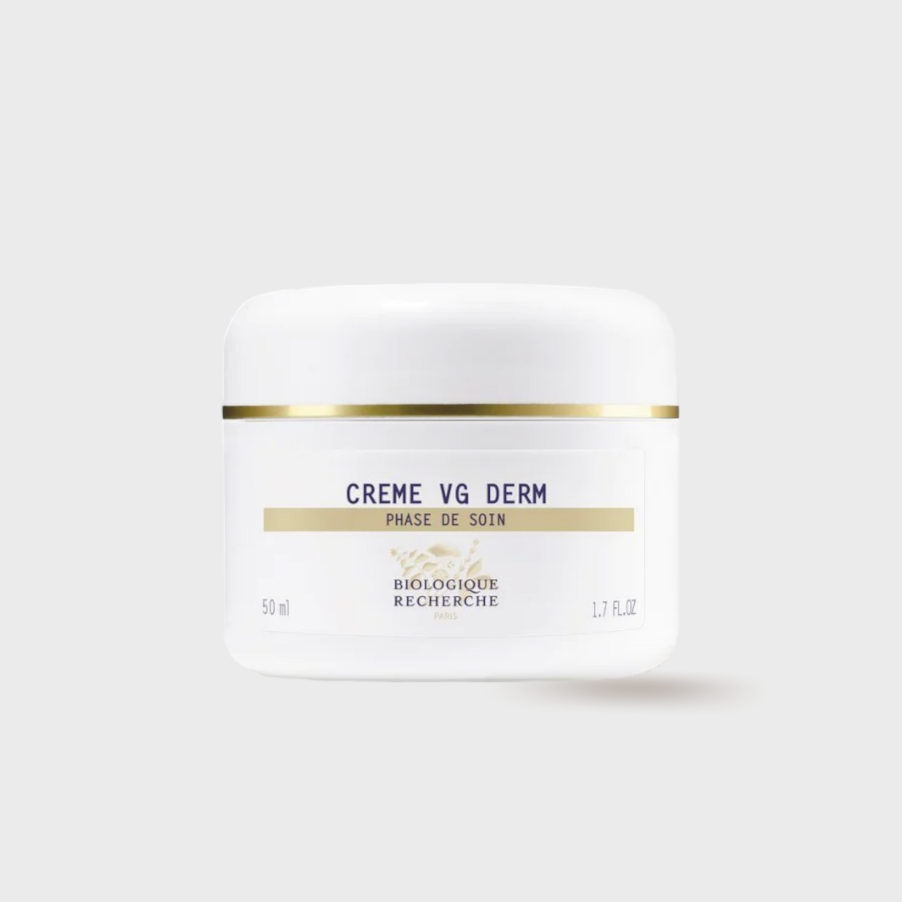 After cleansing with Biologique milk and applying P50 and your serum, remove Biologique Recherche Creme VG Derm from jar with a spatula to avoid bacterial contamination. After emulsifying creme in your hands, apply in upward smoothing movements, starting at decollete and working up.
