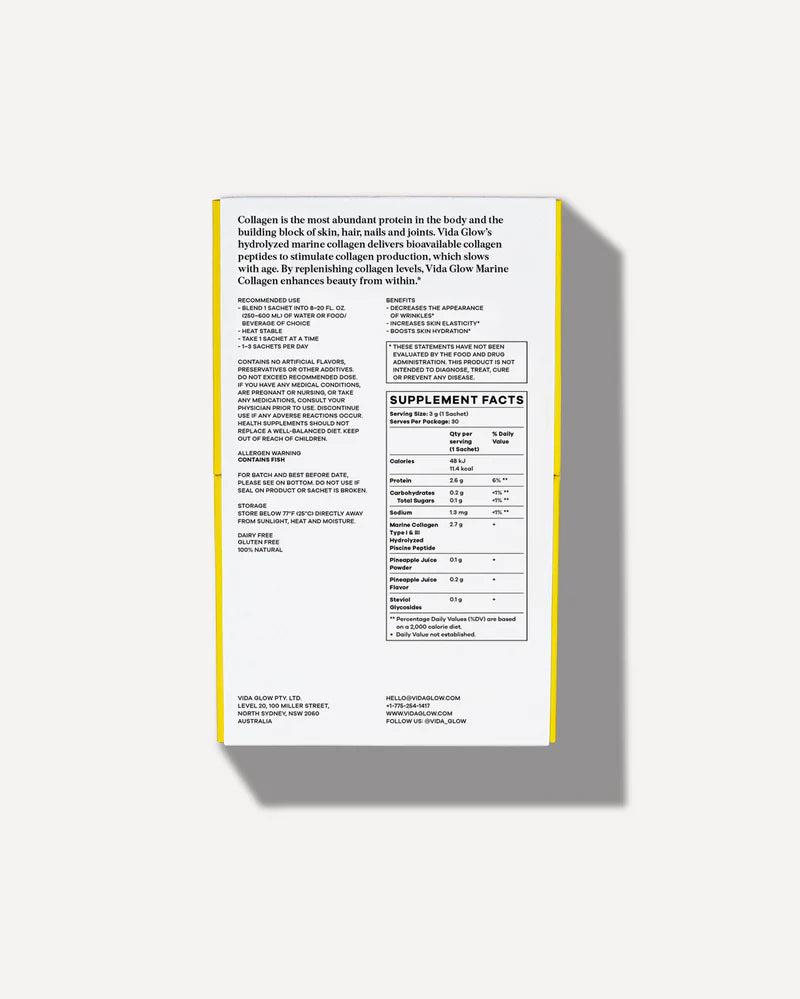 Pineapple Marine Collagen is a collagen peptide supplement made from sustainably sourced fish skin. Vida Glow's hydrolyzed marine collagen has been activated to boost absorption (so your body can actually use it) and stimulate fresh collagen production.
