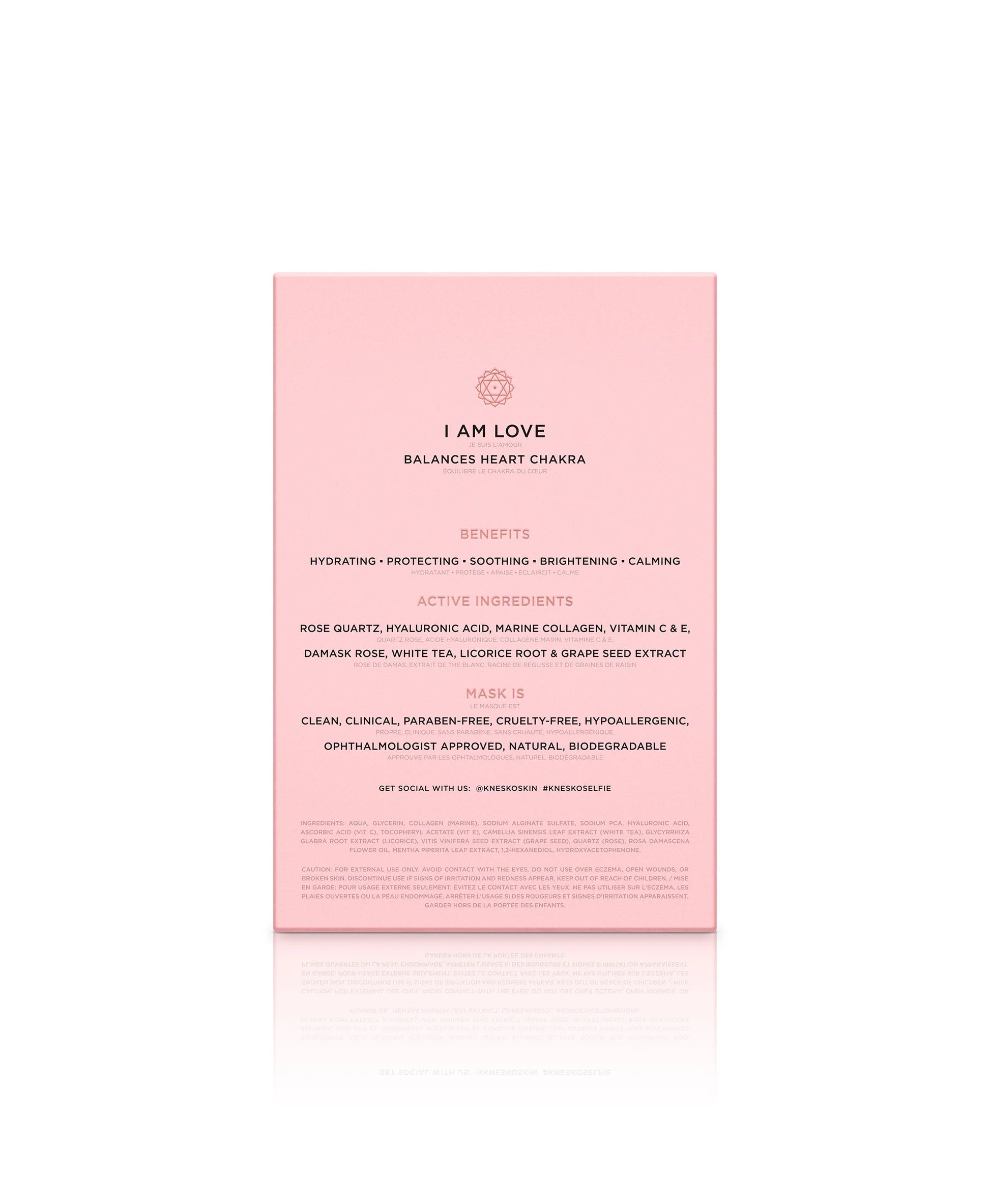 Rose Quartz is aligned with your Heart Chakra or Fourth Chakra, located at your heart. Balancing your Heart Chakra allows you to give and receive love with ease. As you relax and enjoy your masking experience, take deep cleansing breaths and repeat the mantra, “I am Love” three times. Set the intention for yourself to open your heart to love within and around you.